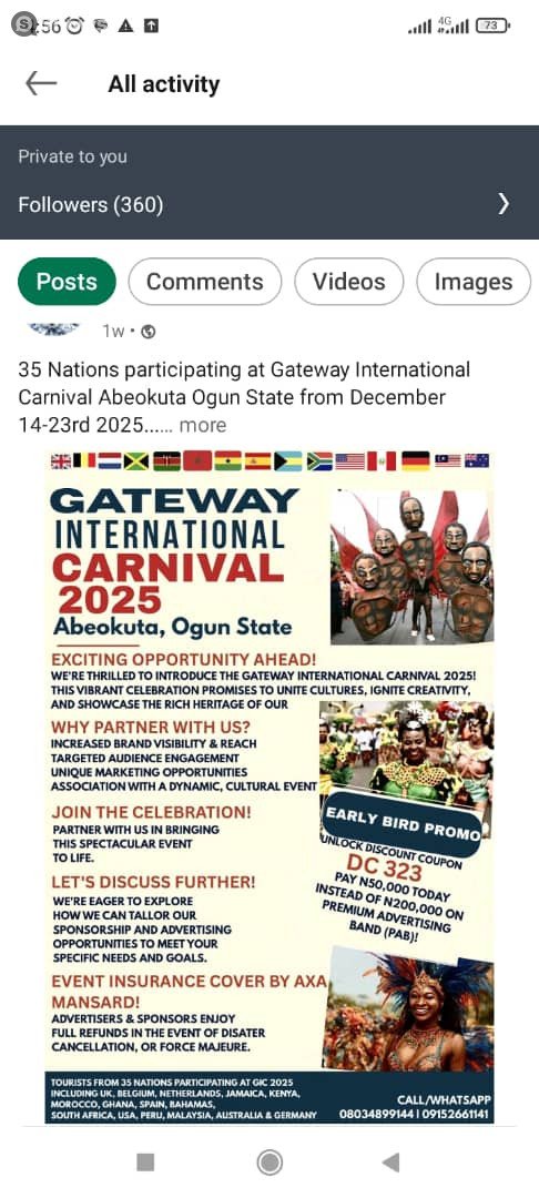 Welcome to GATEWAY INTERNATIONAL CARNIVAL 2025 ABEOKUTA — a standout moment you won’t want to miss. Expect the unexpected—parades, performers, and colorful bursts of joy at every corner. This is a sensory celebration of culture, spirit, and pure human joy. If you love rhythm, movement, and community, this carnival will leave your heart dancing for days. Mark your calendar—Sunday, December 14, 2025 is when it happens. Things get started around 5:30 AM. The event is happening at June 12 Cultural Center Kuto Abeokuta , located at Lalupon Street Kuto Abeokuta , Abeokuta . This carnival is built with intention, energy, and something truly special. Come ready for an experience that will stay with you long after it's over.