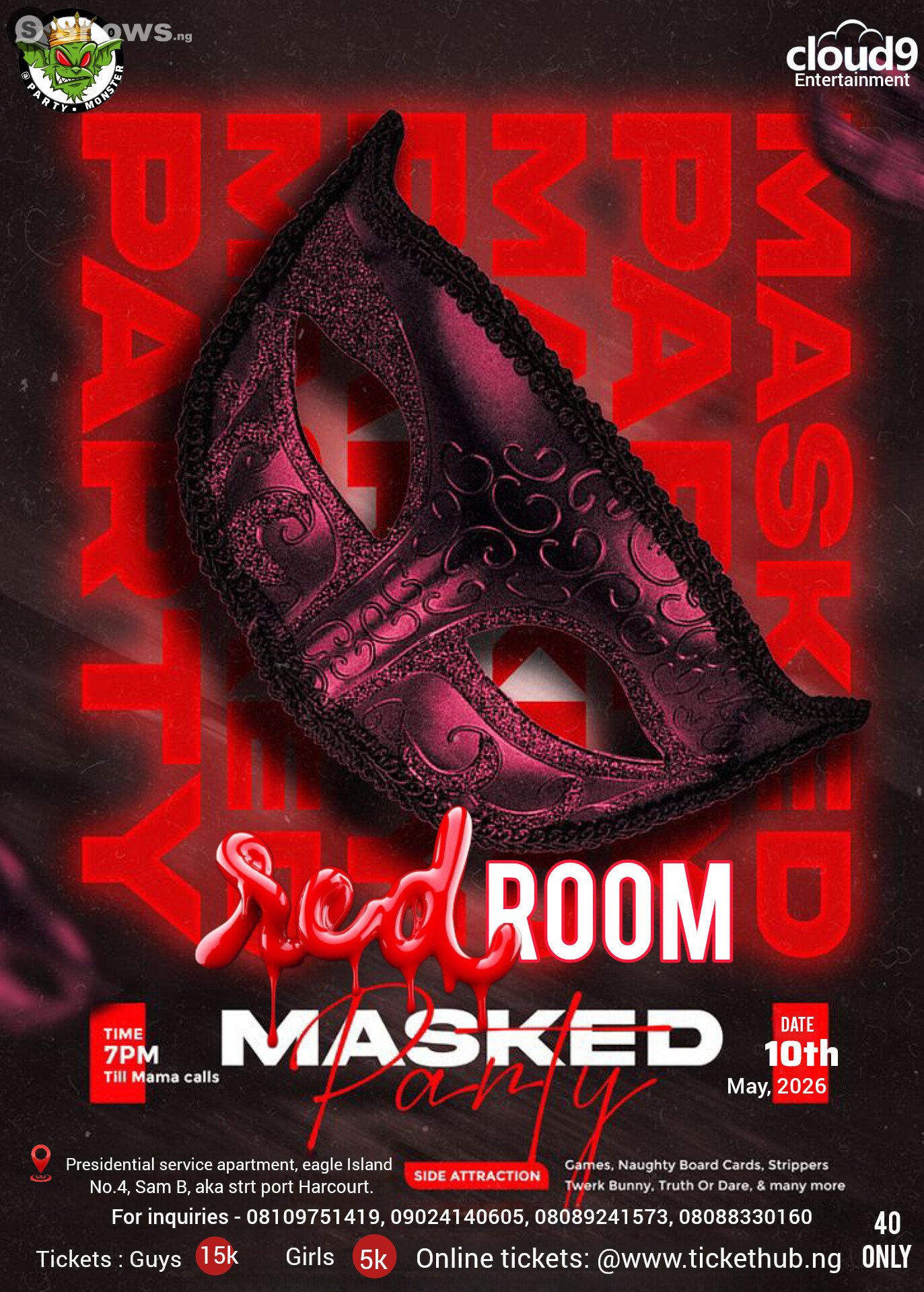Red Room - Masked Party is more than just a hangouts. It’s simple: chill vibes, casual energy, and time to reconnect with people who matter. Whether you're coming for the conversation or just some company, this space is yours. You bring the mood, we’ll bring the comfort. Let’s just hang. It all takes place on Sunday, May 10, 2026. Festivities begin at 7:00 PM. The event is happening at Presidential Service Apartment , located at No. 4 , Sam B Aka Strt Eagle Island, Port Harcourt , Port Harcourt . It’s a chance to connect deeply, share something real, and walk away with stories and friendships that last.