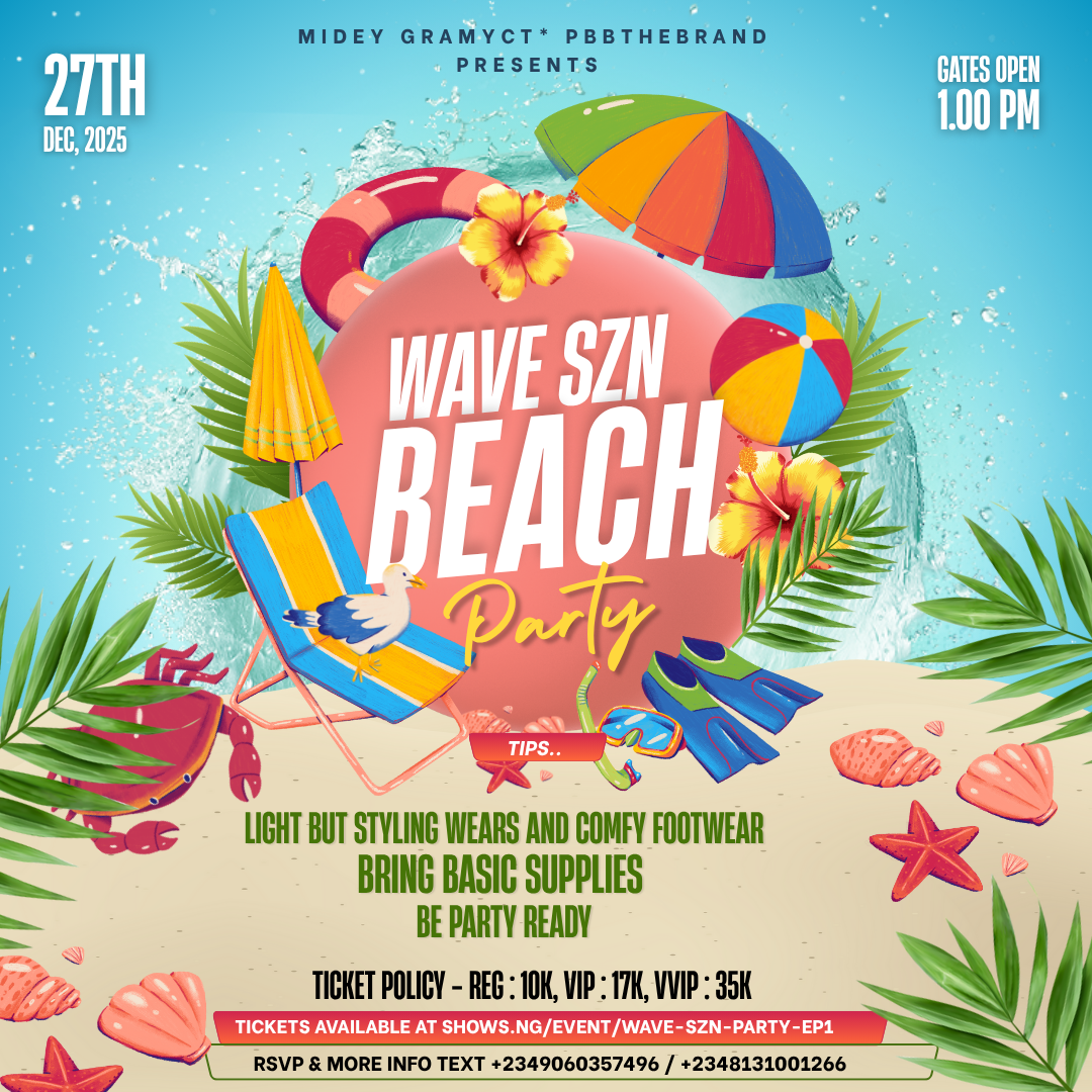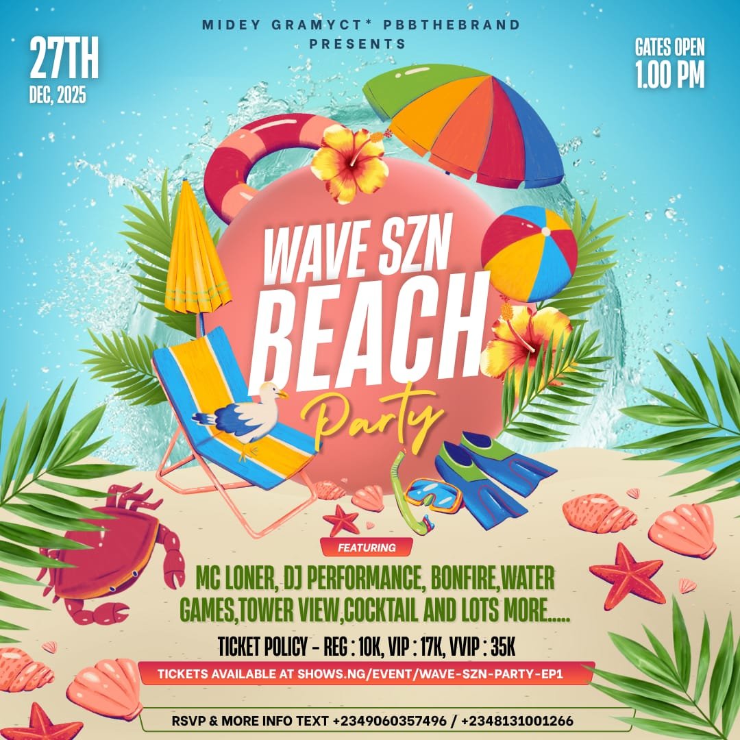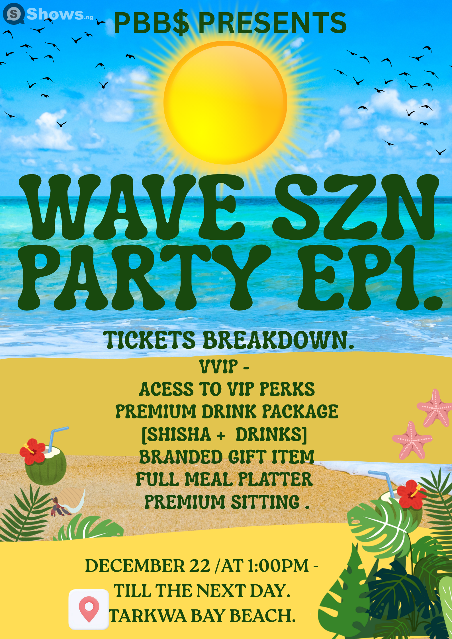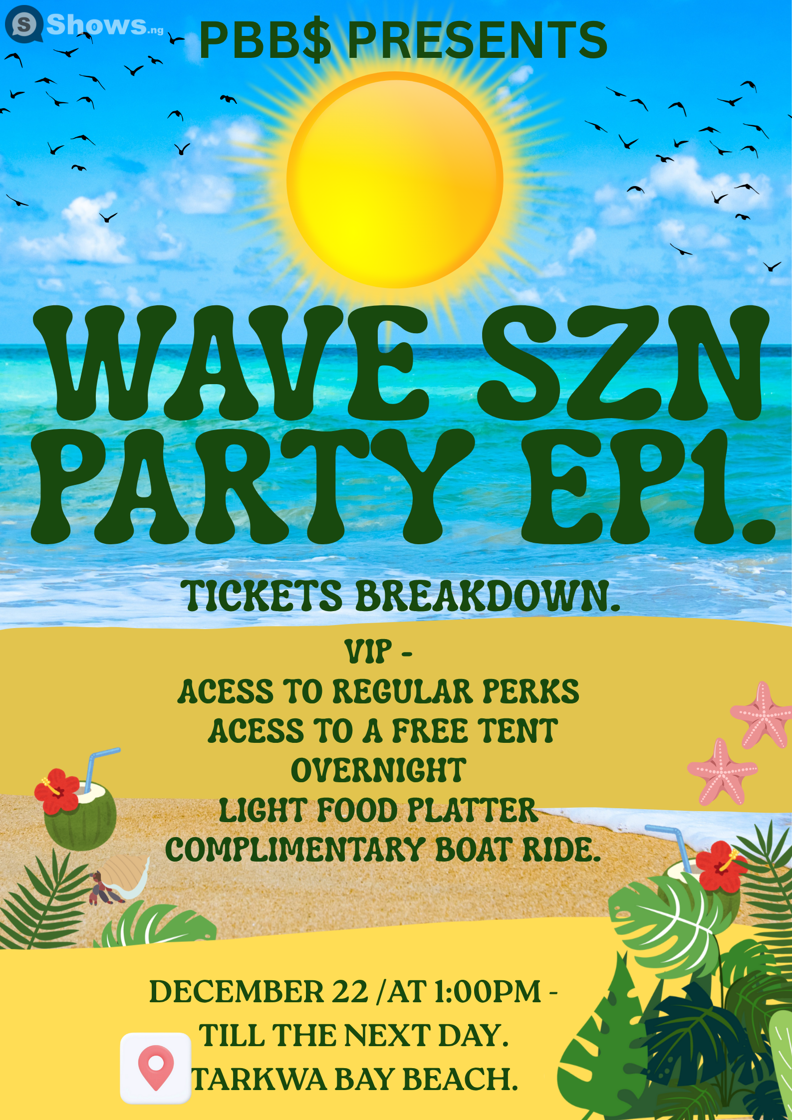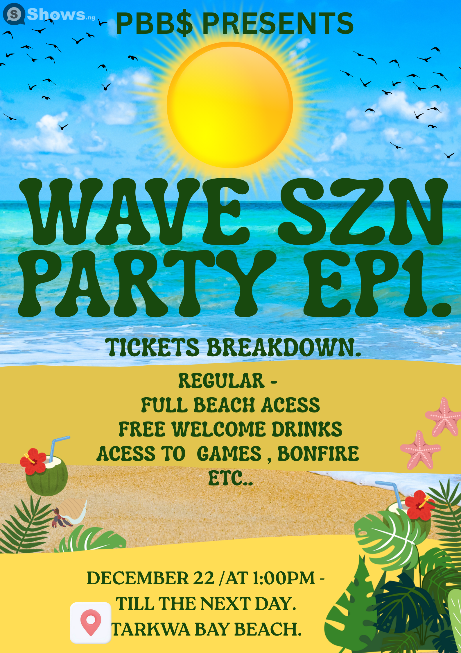 Welcome to WAVE SZN PARTY EP1 — a standout moment you won’t want to miss. It’s simple: chill vibes, casual energy, and time to reconnect with people who matter. Whether you're coming for the conversation or just some company, this space is yours. You bring the mood, we’ll bring the comfort. Let’s just hang. Mark your calendar—Monday, December 22, 2025 is when it happens. Festivities begin at 1:00 PM. The event is happening at TARKWA Bay , located at 01, Lagos Island. This hangouts is built with intention, energy, and something truly special. Come ready for an experience that will stay with you long after it's over.