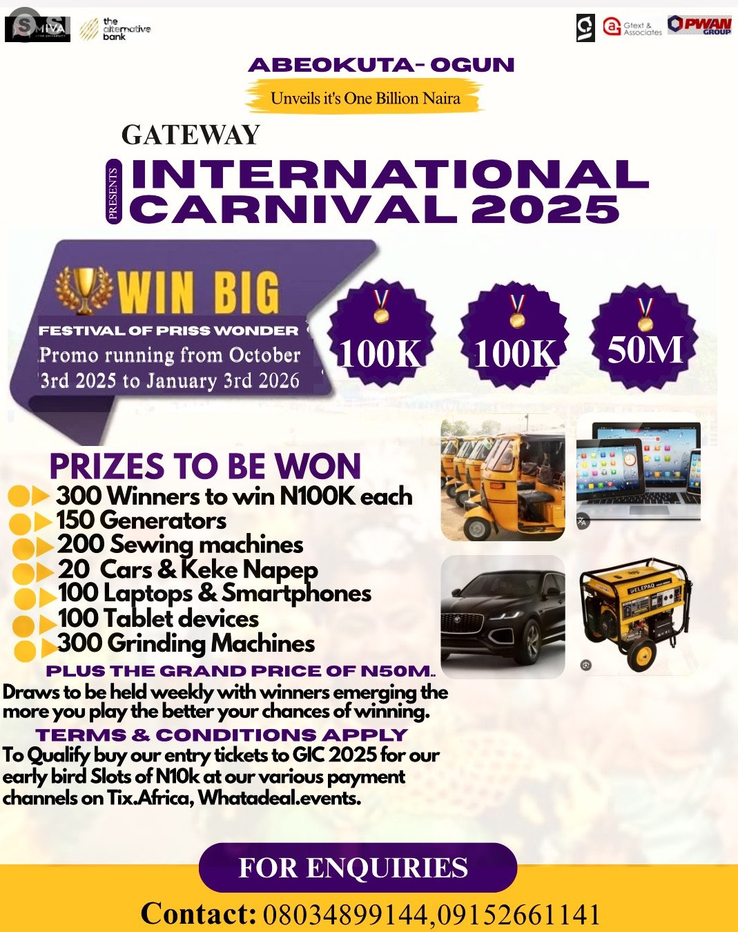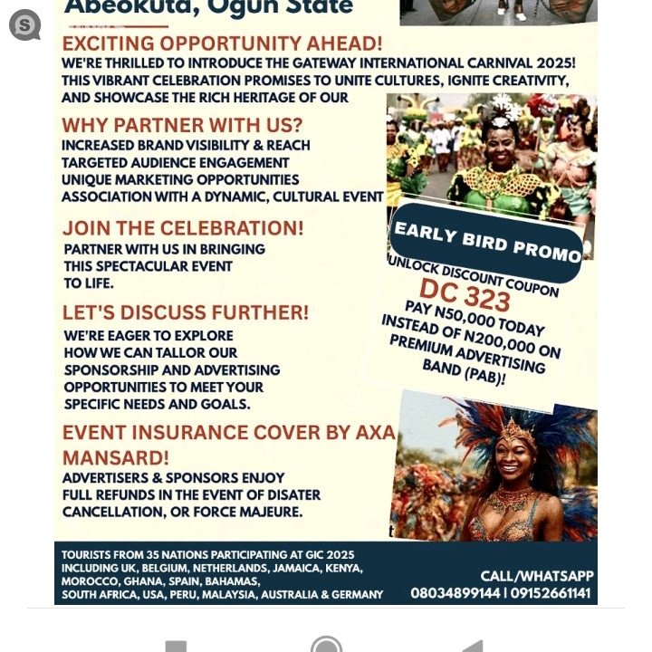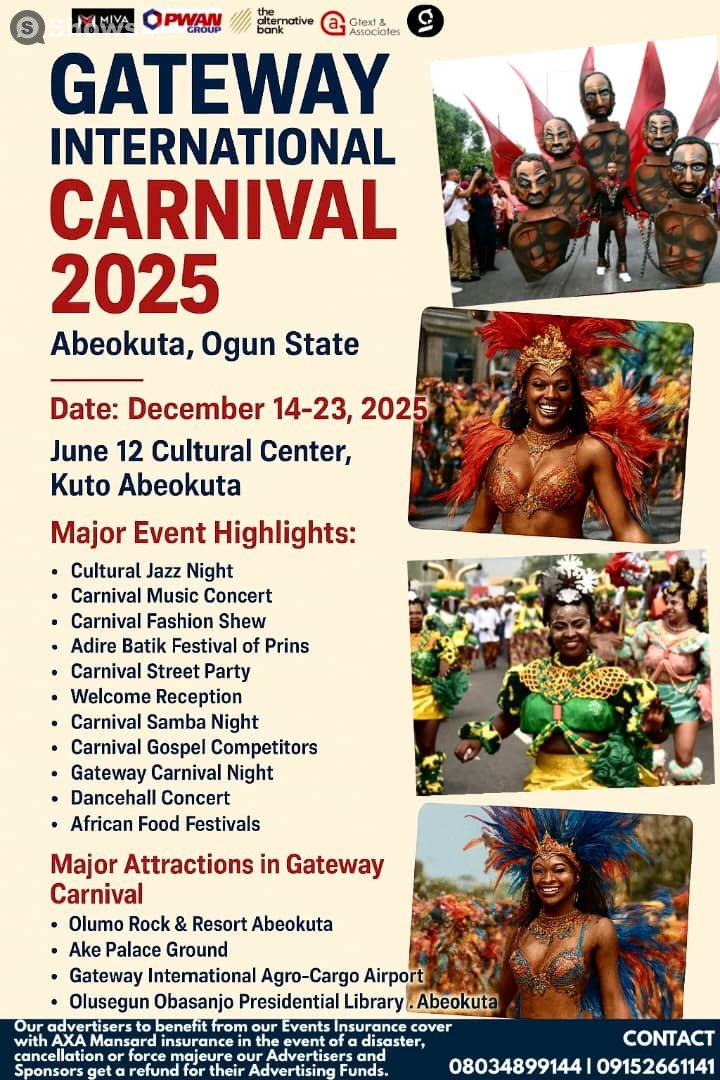Welcome to GATEWAY INTERNATIONAL CARNIVAL 2025 ABEOKUTA — a standout moment you won’t want to miss. Expect the unexpected—parades, performers, and colorful bursts of joy at every corner. This is a sensory celebration of culture, spirit, and pure human joy. If you love rhythm, movement, and community, this carnival will leave your heart dancing for days. Mark your calendar—Sunday, December 14, 2025 is when it happens. Things get started around 5:30 AM. The event is happening at June 12 Cultural Center Kuto Abeokuta , located at Lalupon Street Kuto Abeokuta , Abeokuta . This carnival is built with intention, energy, and something truly special. Come ready for an experience that will stay with you long after it's over.