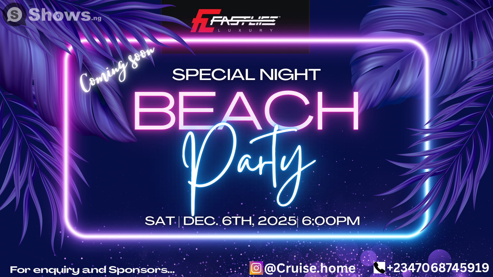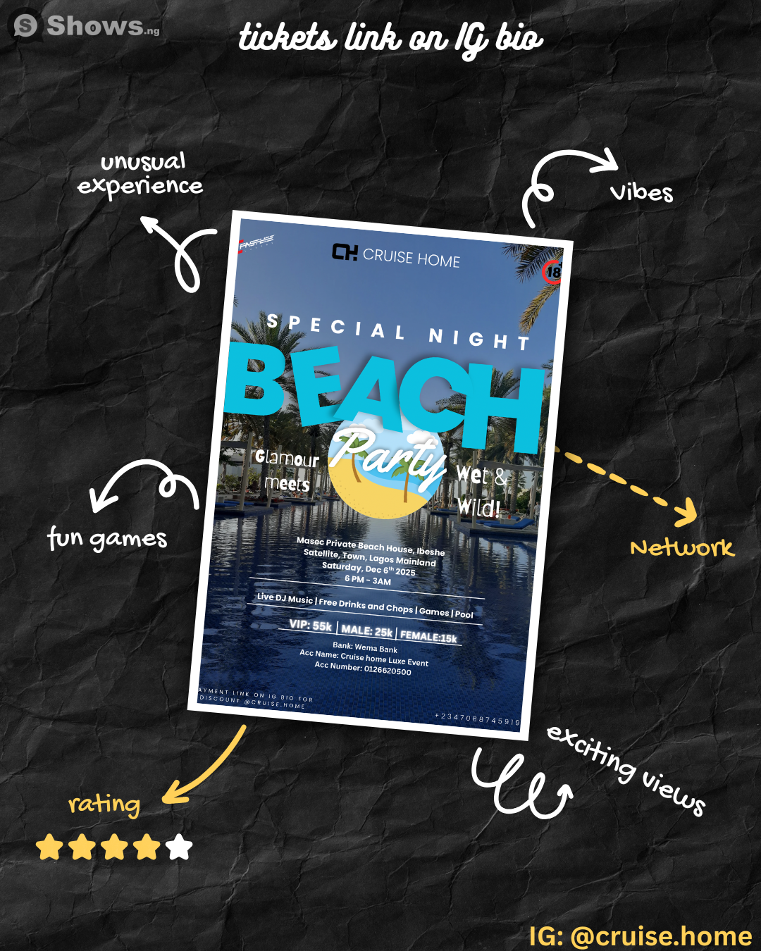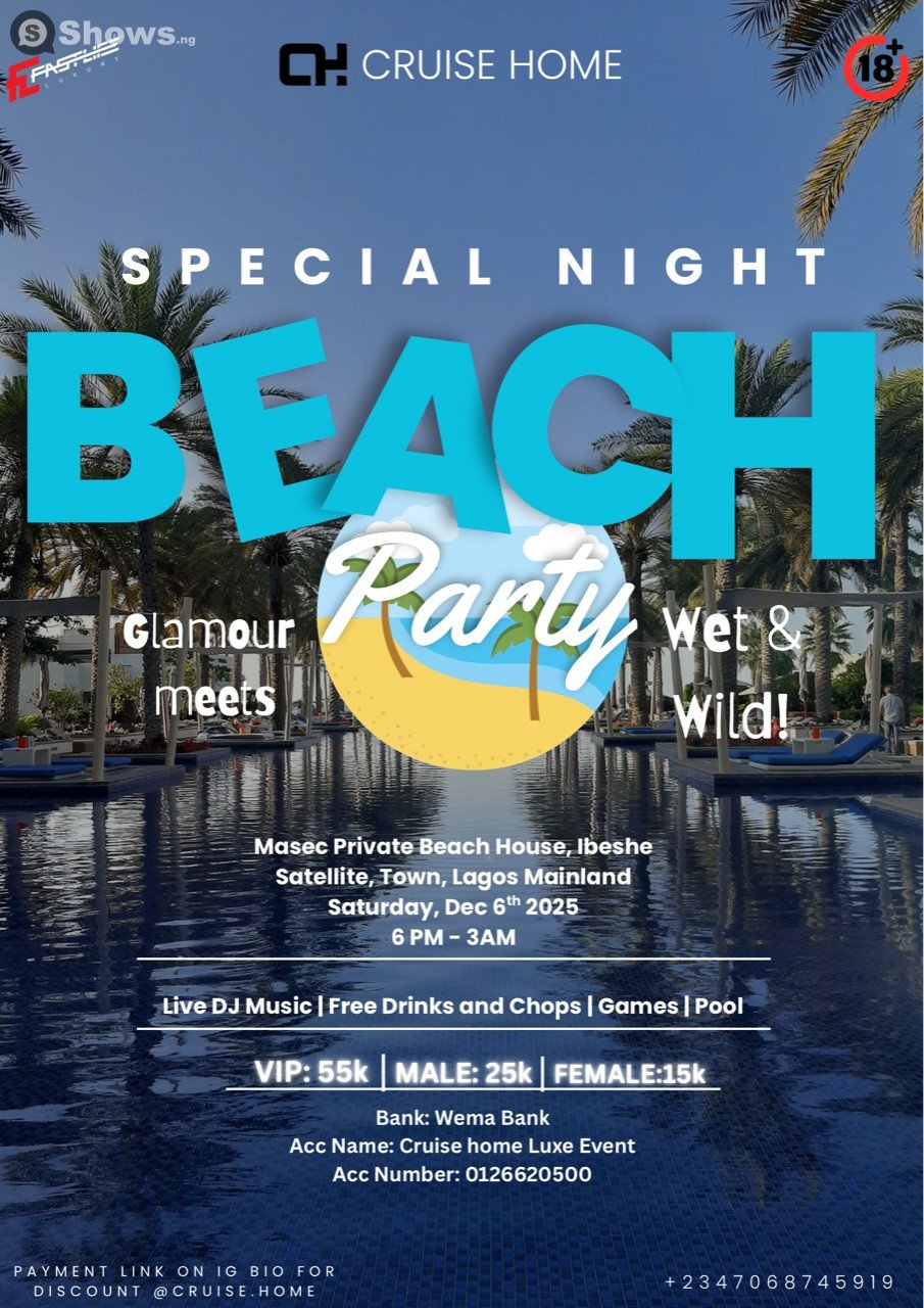 You're invited to The Special Night Beach Party Theme: Glamour Meets Wet And Wild , an experience that blends purpose, connection, and unforgettable moments. It’s simple: chill vibes, casual energy, and time to reconnect with people who matter. Whether you're coming for the conversation or just some company, this space is yours. You bring the mood, we’ll bring the comfort. Let’s just hang. Mark your calendar—Saturday, December 6, 2025 is when it happens. Things get started around 6:00 PM. The event is happening at MASEC Private Beach, Ibeshe Satellite Town Lagos. , located at Abulado, Ibeshe, Lagos, Mainland , Lagos. Whether you're coming with friends or flying solo, there’s something here for everyone—and we can’t wait to see you.
