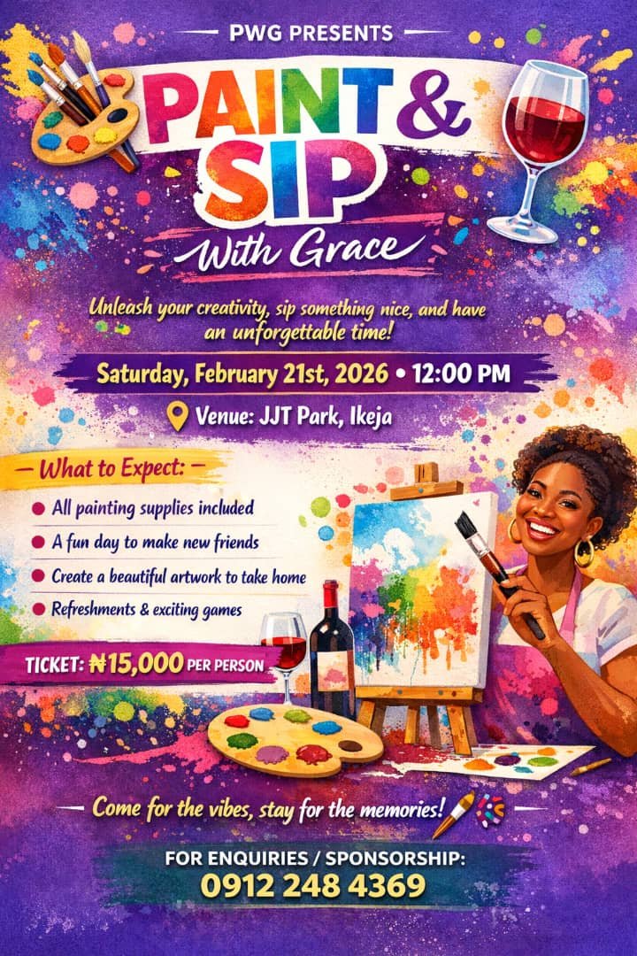 Welcome to Paint And Sip With Grace — a standout moment you won’t want to miss. It’s simple: chill vibes, casual energy, and time to reconnect with people who matter. Whether you're coming for the conversation or just some company, this space is yours. You bring the mood, we’ll bring the comfort. Let’s just hang. Mark your calendar—Saturday, February 21, 2026 is when it happens. Festivities begin at 12:00 PM. The event is happening at Jjt Park Ikeja , located at Alausa Ikeja, Ikeja . This hangouts is built with intention, energy, and something truly special. Come ready for an experience that will stay with you long after it's over.