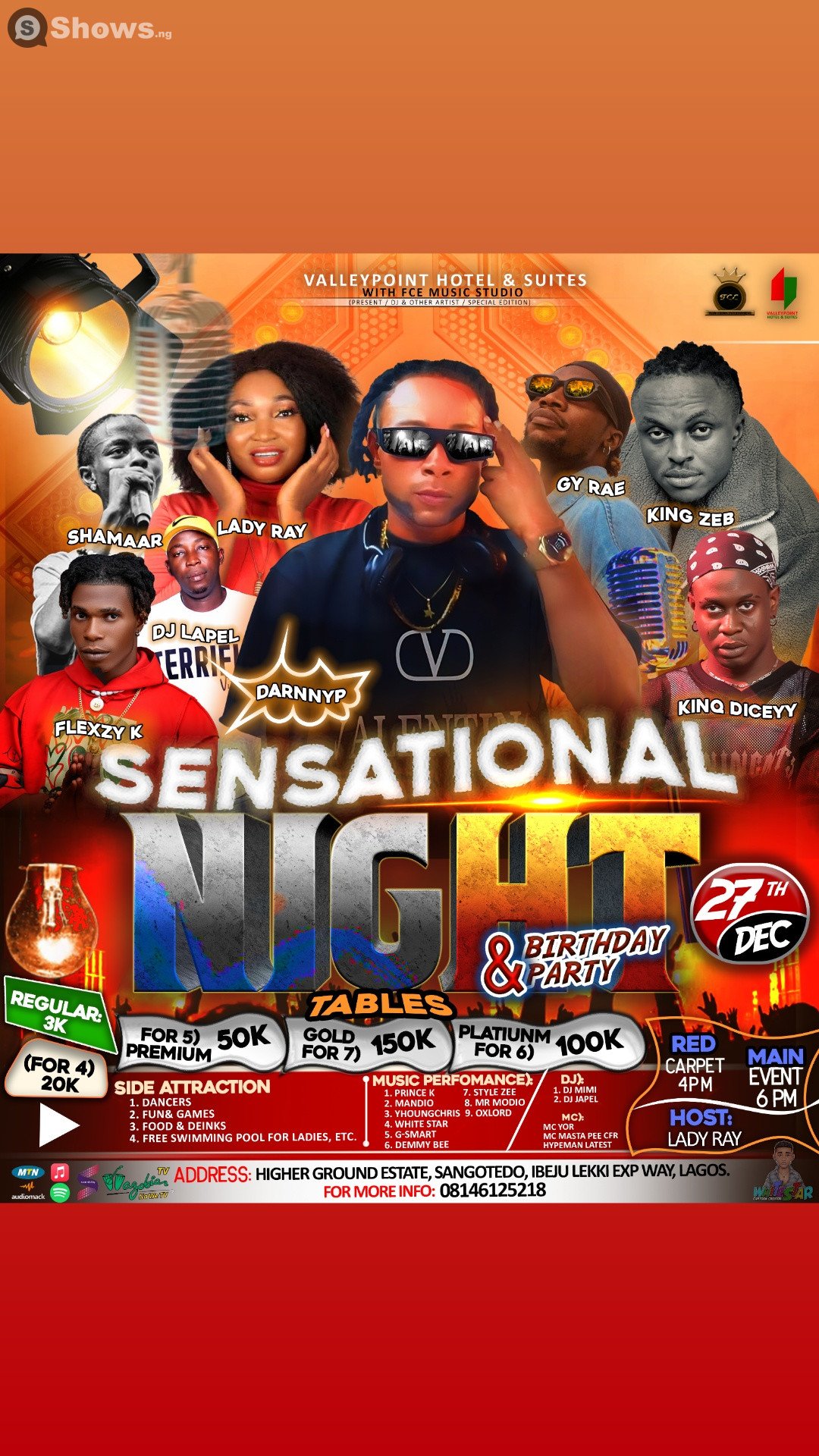 Welcome to SENSATIONAL NIGHT & BIRTHDAY PARTY — a standout moment you won’t want to miss. Lose yourself in a soundscape curated for dreamers, dancers, and diehard music fans. From electrifying headliners to underground gems, this is the kind of lineup people talk about long after the lights go down. Whether you’re swaying under the stars or headbanging by the front stage, the energy will be unforgettable. Mark your calendar—Saturday, December 27, 2025 is when it happens. Festivities begin at 4:00 PM. The event is happening at Valley Point Hotel & Suites Sangotedo Lekki Lagos , located at Higher Ground Estate Sangotedo Lekki Epe Exp Way Lagos , Ibeju Lekki . This music is built with intention, energy, and something truly special. Come ready for an experience that will stay with you long after it's over.